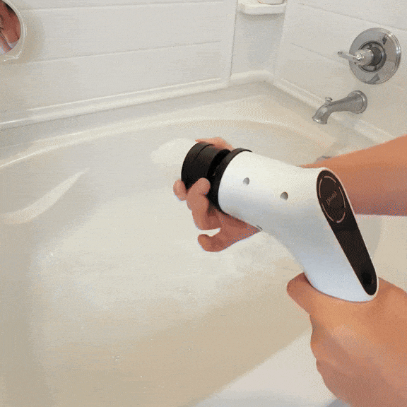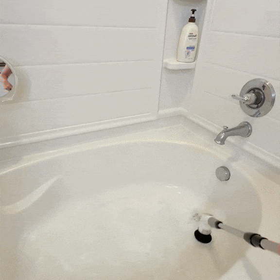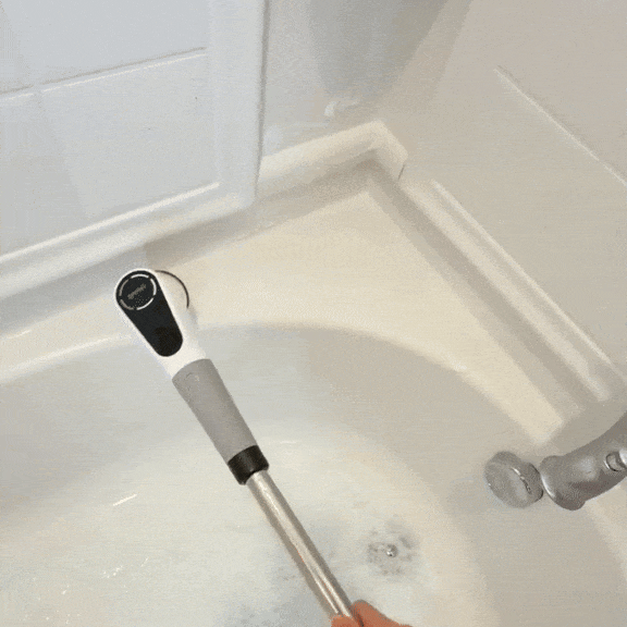 VeloScrub uses a high-torque motor that spins the brush heads up to 350 RPM, breaking down soap scum, mildew, and grime without scrubbing by hand. Just apply your cleaner, press a button, and let the motor do the heavy lifting.